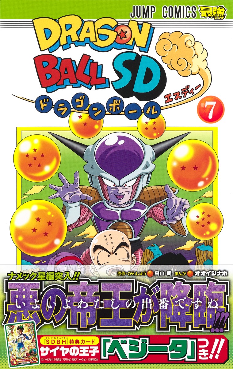 Shueisha a enfin dévoilé la couverture du tome 7 du manga Dragon Ball SD, qui paraitra le 4 février 2021 au Japon. Intitulé « Départ vers Namek !« , ce nouveau tome de 192 pages reprendra l’histoire à partir du chapitre 59 et racontera donc la fin de l’arc Saiyan, et introduira ensuite l’arc Namek. Le volume contiendra également une carte du jeu Super Dragon Ball Heroes de Vegeta. Les précommandes sont disponibles sur Amazon Japon au prix de 600 ¥ hors taxes (environ 4,75 €).