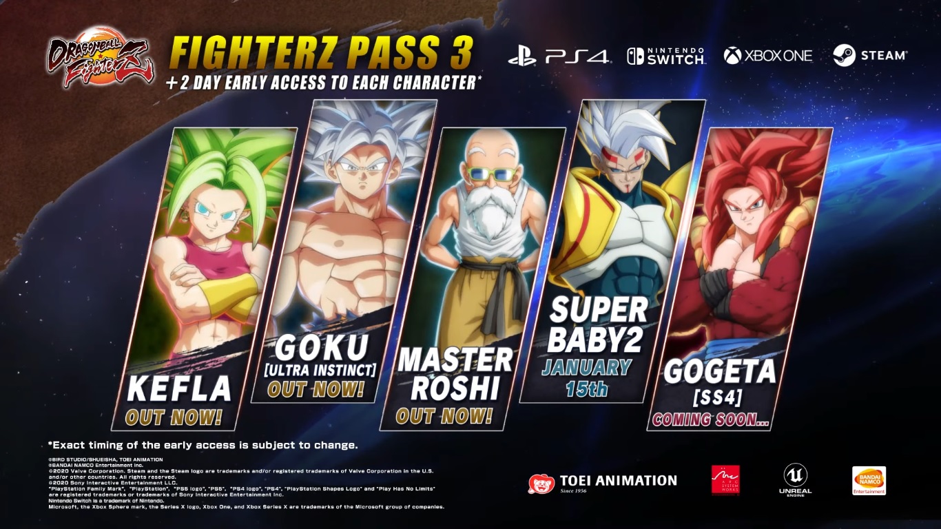 Disponible depuis février 2020, le FighterZ Pass 3 de Dragon Ball FighterZ donne accès à 5 nouveaux personnages jouables. Parmi eux, Kefla, Goku Ultra Instinct, Master Roshi et Super Baby 2 déjà disponibles, et Gogeta SSJ4. Le FighterZ Pass 3 est vendu au prix de 19,99€. Il est également possible d’acheter chaque personnage du Pass à l’unité pour 4,99€ chacun.