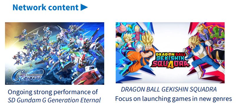 Dans sa présentation, Bandai indique que Dragon Ball, One Piece et Gundam sont vraiment les licences entraînantes des différents secteurs, avec une forte présence. Bandai indique notamment que ses Bandai Store au Japon sont assez performants, et compte multiplier les évènements comme à l’anime expo.