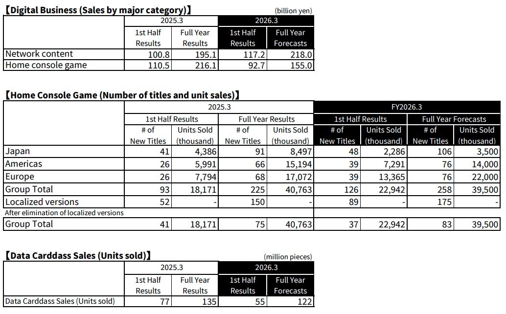 Le secteur Digital Business a vendu 22.9 millions de copies de jeux vidéo au T2 2026 pour 126 nouveaux titres (37 si on enlève les versions localisées). Soit un résultat de 117.2 milliards de Yen pour le contenu en ligne (apps, DLC, etc.) (contre 101 au T2 2025) et 92.7 milliards pour les jeux vidéo physiques (-24%). Notons que pour l’année fiscale 2026, Bandai prévoit une année pleine (et a relevé ses prévisions) avec 258 nouveaux titres (83 si on enlève les versions localisées), soit 8 de plus qu’en 2025, pour un résultat financier prévu de +11% sur le contenu en ligne et un peu en deçà sur les contenus physiques (-20%).