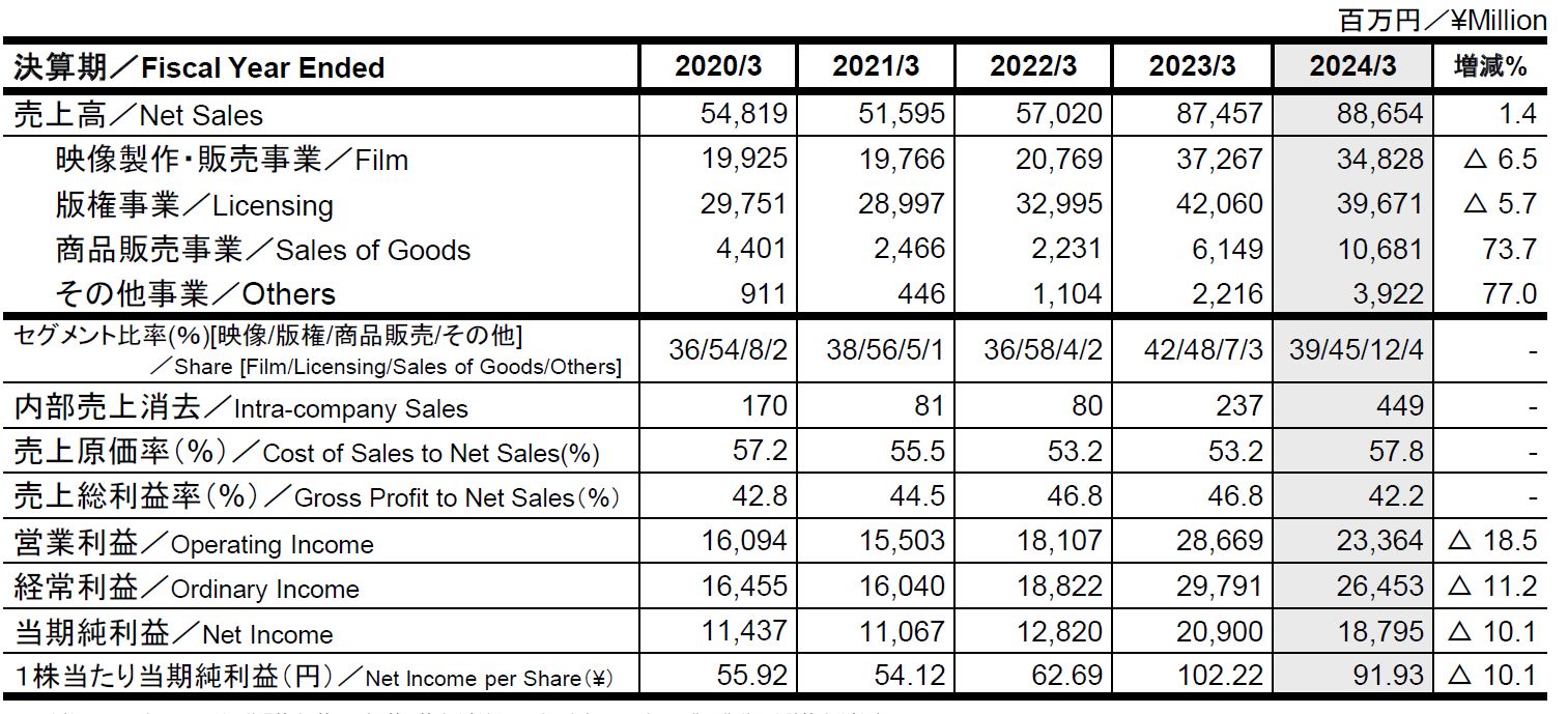 Elle indique ainsi que son chiffre d’affaires a augmenté de 1.4% pour passer de 87 milliards Yen en 2023 à 88 milliards de Yen (530 millions d’euros), pour un revenu net en baisse de 10% (20.9 milliards à 18.795 milliards de Yen en 2024) notamment dû au fait que le Yen a connu une forte dévaluation monétaire en ce début d’année. Le secteur Films a rapporté 34.8 milliards de Yen (-6.5%), les Licences (Propriété intellectuelle) 39.6 milliards de Yen (-5.7%) et le merchandising 10.6 milliards (+73% !!).