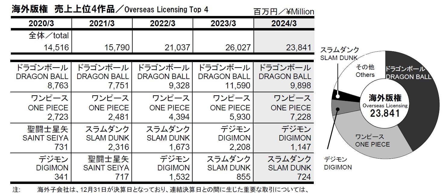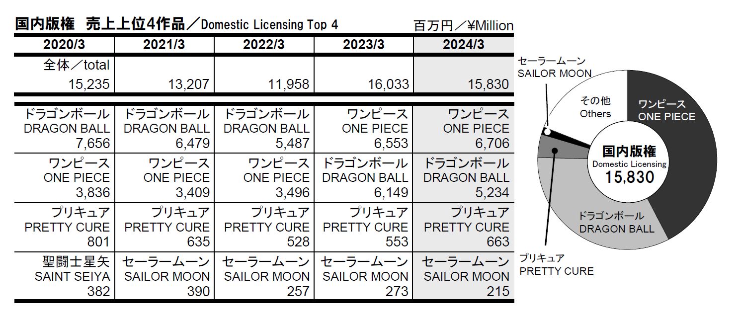 Au Japon ce sont les droits de merchandising et de licences de jeux One Piece qui ont boosté les revenus tandis que ceux concernant Dragon Ball ont diminué au Japon comme à l’international.