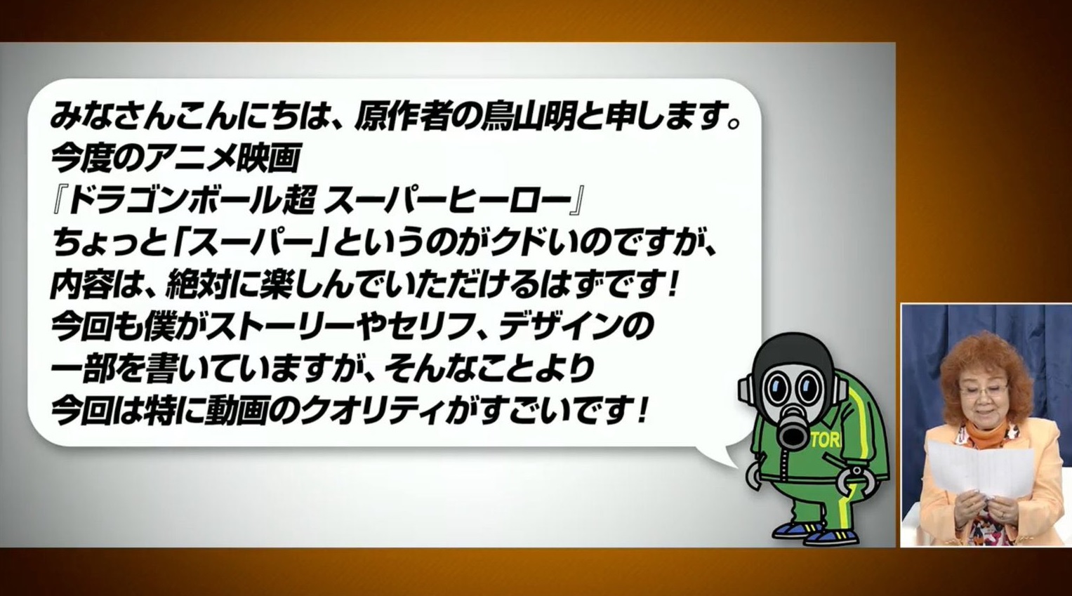 Bonjour tout le monde, je suis Akira Toriyama, l’auteur original. Pour ce nouveau film « Dragon Ball Super : Super Hero », le « Super » peut être un peu répétitif, mais vous devriez trouver le film lui-même très agréable ! Cette fois, je me suis occupé de l’histoire, des dialogues et quelques designs de personnages mais plus important : la qualité de l’animation est particulièrement incroyable !