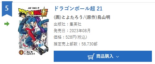 Voici les chiffres de vente du tome 21 de Dragon Ball Super pour sa deuxième semaine de commercialisation au Japon, partagés comme toujours par le site japonais Oricon.