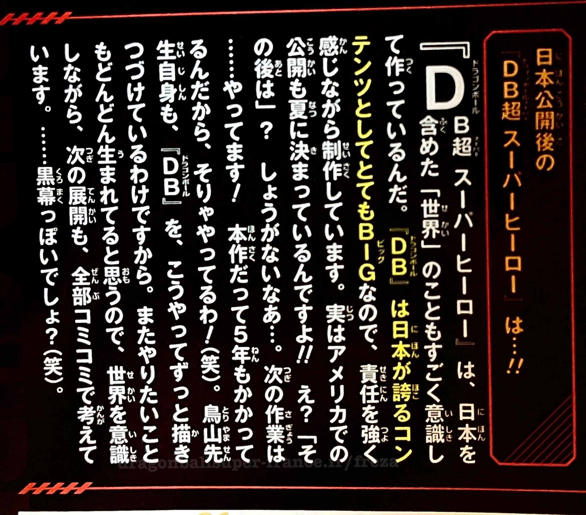 Dragon Ball est un contenu extrêmement « big » et une fierté japonaise, et c’est donc en considérant fortement ces responsabilités que je produis mon travail. Pour dire vrai, il est déjà décidé que le film sortira aux États Unis cet été.