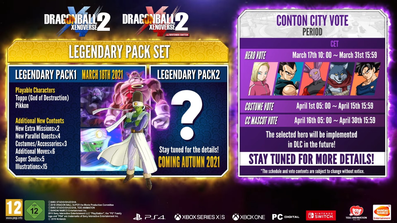 Annoncé lors d’un trailer pendant le Dragon Ball Games Battle Hour, le DLC Legendary Pack 2 débarquera cet automne. Et pour la première fois, les joueurs pourront voter afin de choisir le personnage qu’ils aimeraient voir arriver dans le jeu parmi Goku Ultra Instinct non-maitrisé, Dyspo, Bergamo, Vegeta de DBGT, et C18 de DB Super. En plus de choisir un personnage, les joueurs pourront également voter pour les prochains costumes et Mascottes CC.