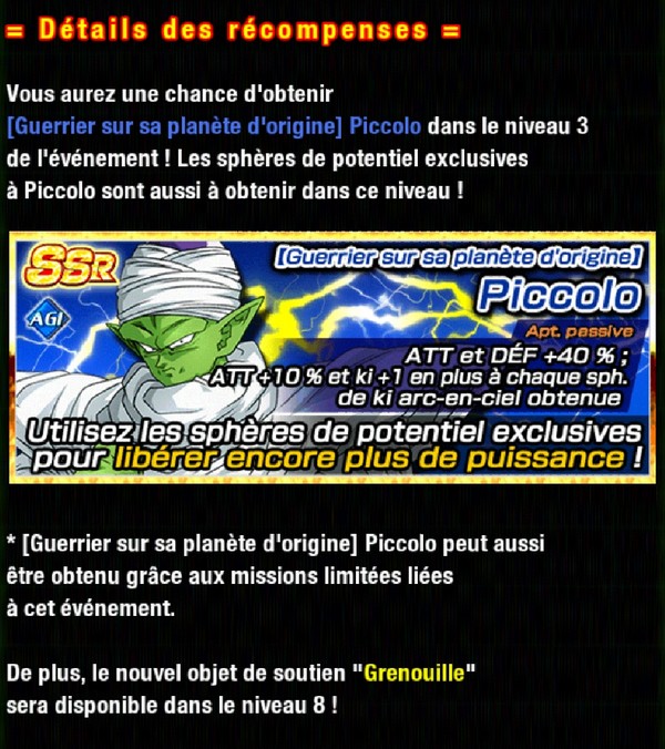 Venez tenter cet event histoire pour remporter le Piccolo SSR AGI et le monter full power / potentiel débloqué et spé10, en vue de son éveil Suprême Z prochainement ! Tout cela dans : Dragon Ball Z Dokkan Battle : Le Redoutable Commando Ginyu ! Huit niveaux sont disponibles :