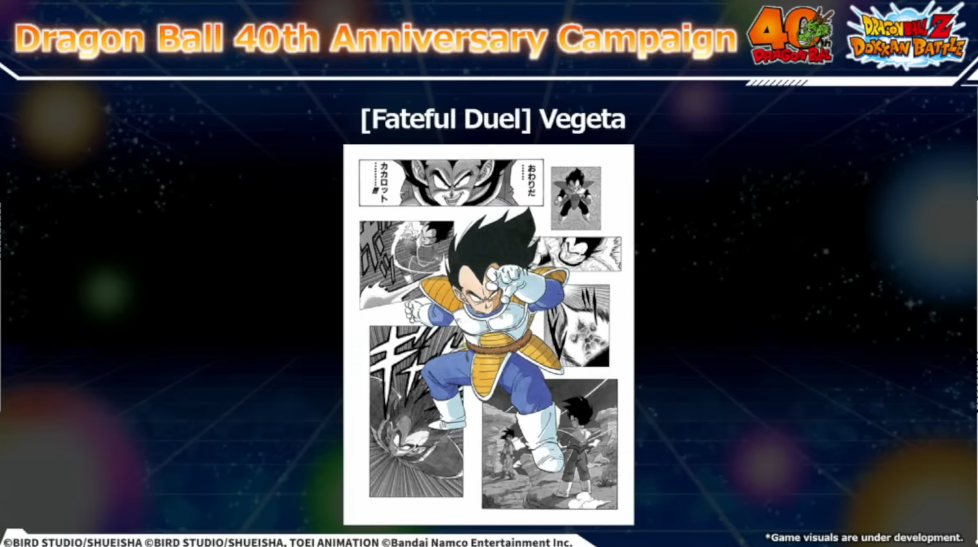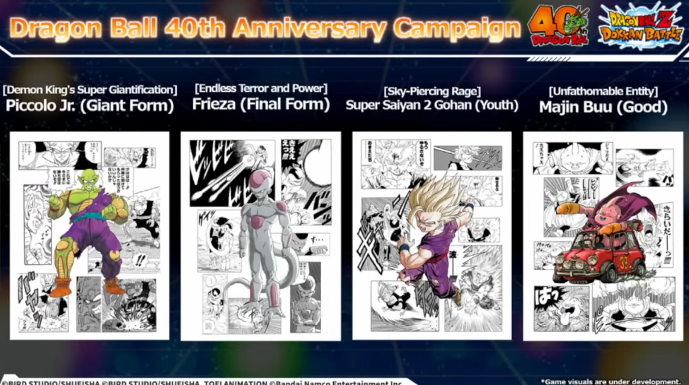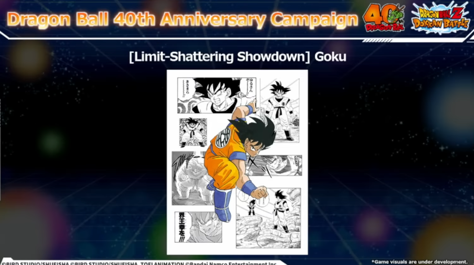 De plus, une campagne de célébration des 40 ans de Dragon Ball débutera le 29 octobre dans Dokkan Battle. Celle-ci introduira des personnages du manga et reprendra des illustrations originales de ce dernier pour les cartes. Le premier personnage sera Son Goku, qu’il sera possible d’obtenir via les bonus de connexions et les missions durant la campagne. Par la suite, cinq personnages seront disponibles dans un portail; Vegeta, Piccolo Jr. (Géant), Freezer (Forme Finale), Gohan Super Saiyan 2 (Jeune), et Majin Buu (Bon)