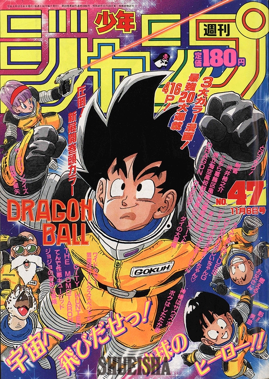 Dans le Weekly Shonen Jump n° 47 de 1989, Bulma, Gohan et Krillin arrivent enfin sur la Planet Namek. La couverture les représente, accompagnés de Goku, Kamesennin et Umigame, vêtus de combinaisons spatiales assorties. Les illustrations ont été dessinées séparément puis assemblées pour créer une charmante composition où l’on voit toute la bande s’amuser en flottant dans le cosmos. Le logo sur les gants indique que leurs combinaisons spatiales ont été conçues par Capsule Corporation.