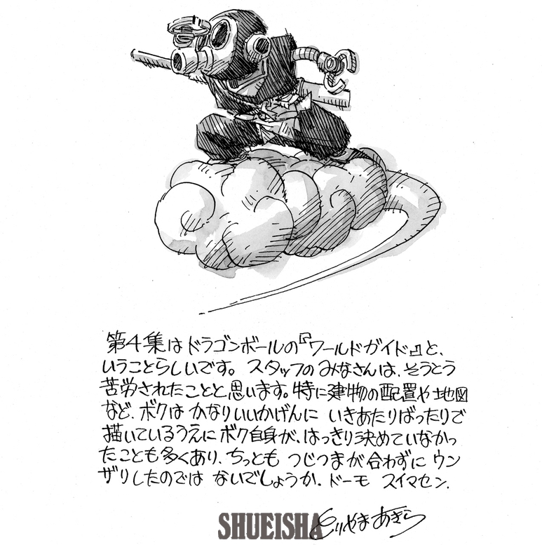 » Il semblerait que ce 4ème volume soit un « Guide du monde » de Dragon Ball. Je pense que l’équipe entière a travaillé très dur, particulièrement sur l’agencement des bâtiments, des cartes et autres. En plus d’avoir dessiné des choses un peu comme elles viennent, il y a beaucoup d’éléments que même moi, je n’avais pas défini avec précision. N’en ont-ils pas eu marre de voir que les choses ne se mettaient pas en place de manière cohérente ? J’en suis vraiment désolé. – Akira Toriyama «