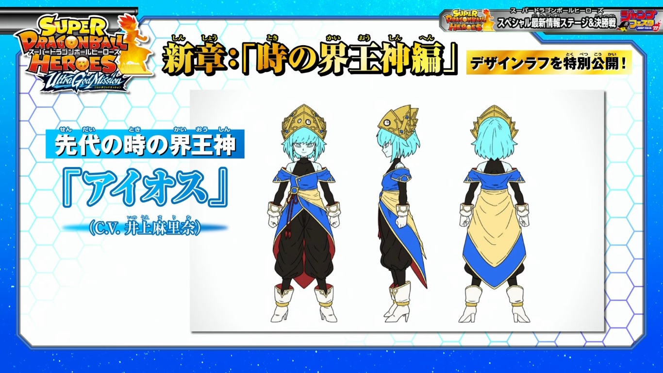 Parmi le peu d’information dévoilé sur la Ultra God Mission, nous avons appris l’identité du mystérieux personnage qui apparait dans le teaser. Il s’agit de Aiosu, la précédente Kaioshin du temps, qui était donc en fonction avant Chronoa. On apprend également qu’il y a en fait quatre guerriers encapuchonnés, et que d’après les chara-design montrés, l’un d’eux serait un Namek. On ignore de qui il s’agit, mais il faudra pour le moment se contenter de son nom officiel « Le guerrier Namek vêtu de noir ».